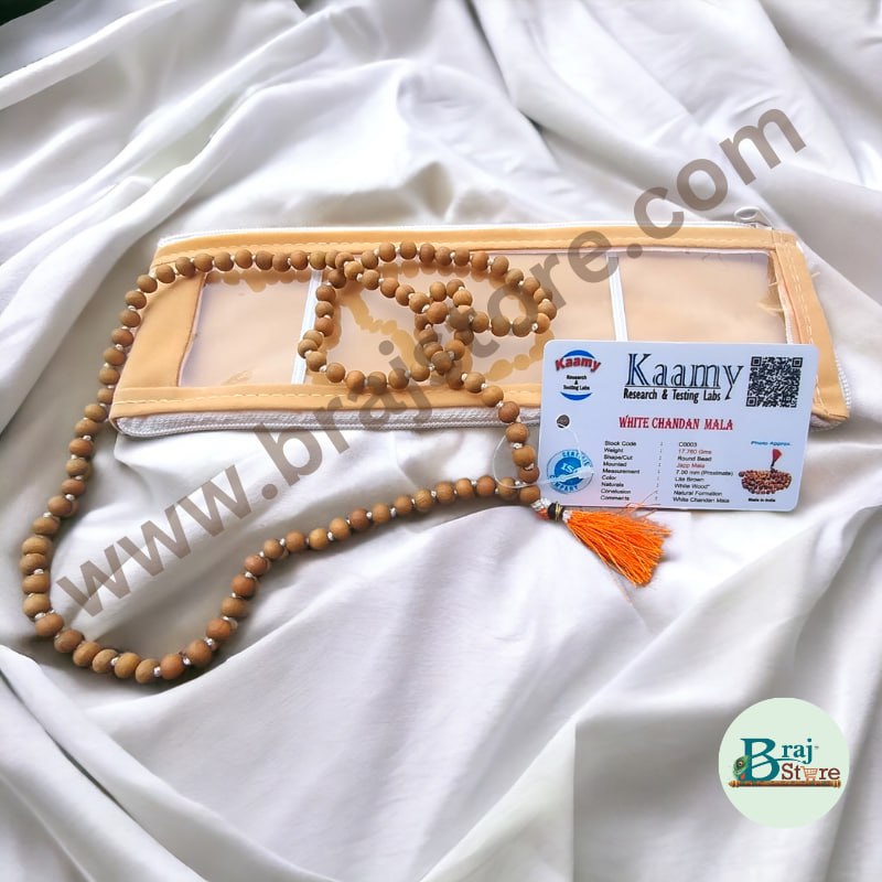 BrajStore Presents: The fragrance of the sandalwood is considered cooling, calming, and soothing. The Japa on Sandalwood Mala results in a Glow on the face. White chandan mala is widely believed to use sandalwood rosary beads to speed up healing and reduce stress. white Sandalwood helps promote humility and its scent is believed to aid in maintaining a person's alertness while meditating. Wearing sandal mala has a cooling effect on the mind and it soothes pitta dosh. White Sandalwood mala to cure skin-related problems and cooling. It is used for peace and empowering rituals and for worshipping all deities.